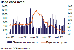 По нашим оценкам, рост торговой активности евро обусловлен всё большим открытием иностранными компаниями счетов в Газпромбанке для оплаты газа в рублях. Недавно об этом заявляла итальянская Eni, а Евросоюз фактически разрешил платить за сырьё по новой схеме, выдвинутой российскими властями. Данное явление формирует избыточный спрос на национальную валюту, что в условиях ограниченного движения капитала образует арбитражные возможности. Полагаем, что торговая активность продолжит расширяться по мере роста спроса на энергоносители, а евро в моменте может становиться дешевле доллара ещё не раз.