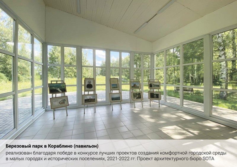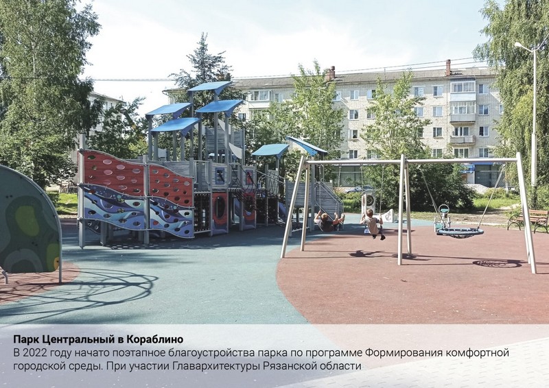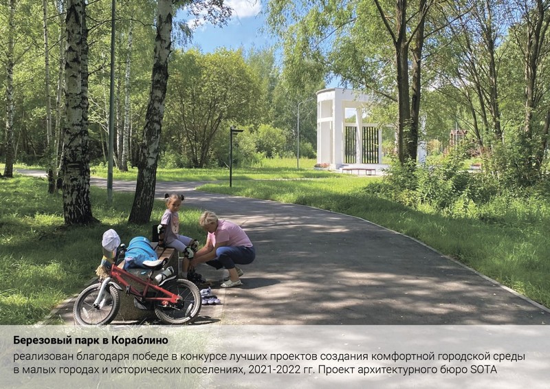 Ведомство отметило в посте также благоустройство Березового парка. В 2021 году город Кораблино победил в конкурсе малых городов с концепцией благоустройства парка от архитектурного бюро SOTA, что позволило получить финансирование и реализовать проект — один из самых масштабных в Рязанской области. Сейчас, как отмечает Главархитектура региона, парк стал одним из любимых мест отдыха жителей, а Кораблино является одним из самых благоустроенных городов Рязанской области, наряду с Михайловом и Сасово.