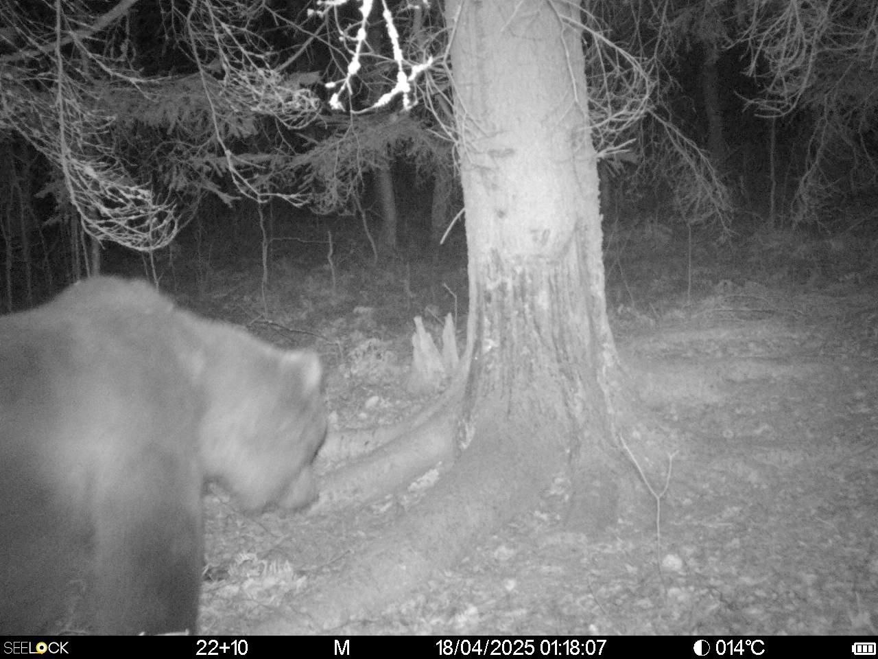 Также сообщается, что медведь прошествовал по дороге из западной части заповедника в центральную и вчера ночью побывал у одной из кабаньих чесалок.