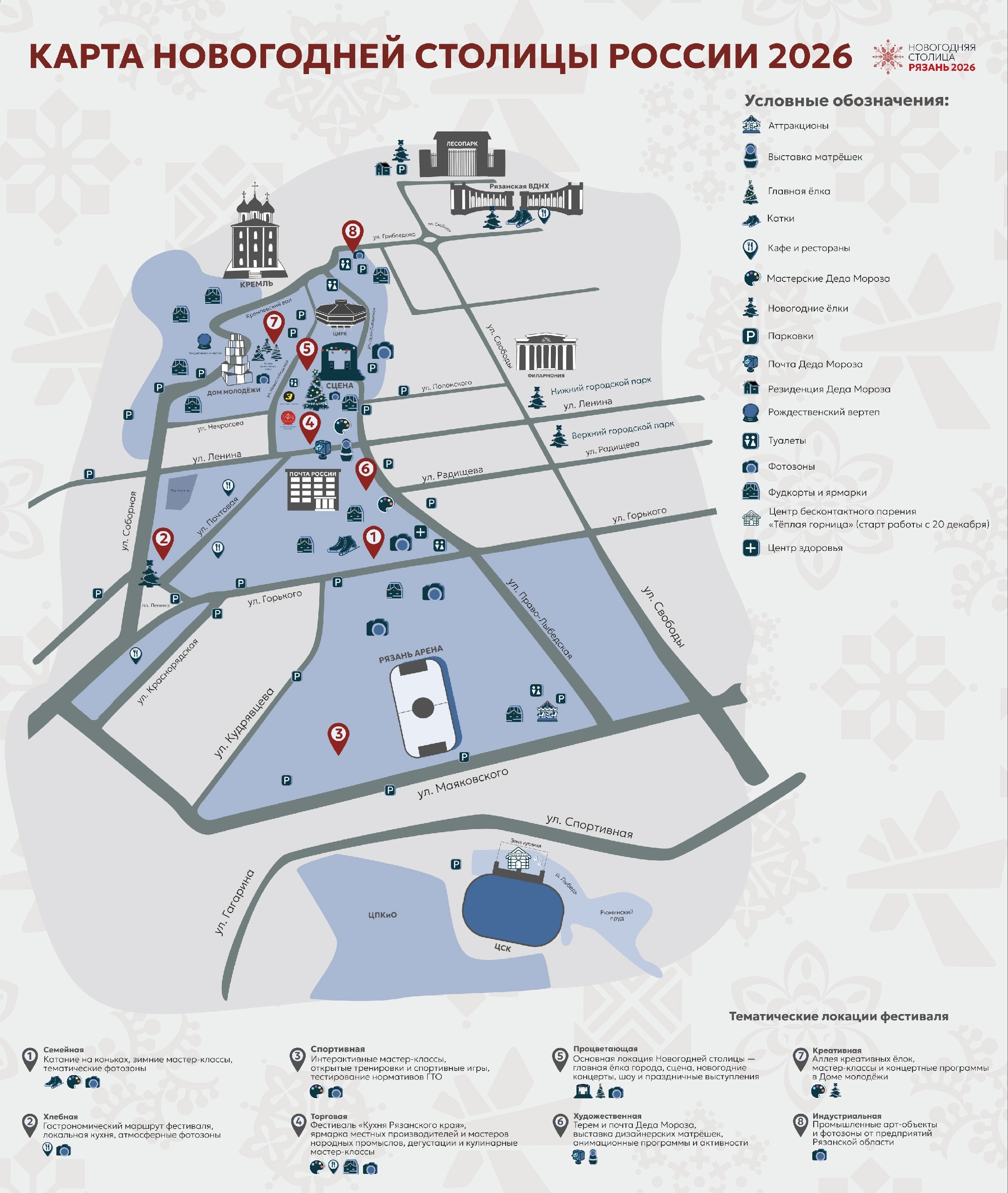 напоминает о том, что незабываемое празднование Новогодней столицы России стартует уже 13 декабря. Для жителей и туристов Рязани подготовили карту фестивальной площадки, чтобы можно было заранее спланировать свои приключения и ничего не пропустить.