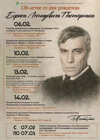 Мероприятия (12+) пройдут с 6 по 14 февраля. В том числе, научно-практическая конференция, выставка «Февраль. Достать чернил…», литературно-музыкальная гостиная «Циферблат вечности», выступление чтецов с произведениями Пастернака, экскурсия по городу «Касимовские улочки. Бориса Пастернака», выступление Губернаторского камерного оркестра.