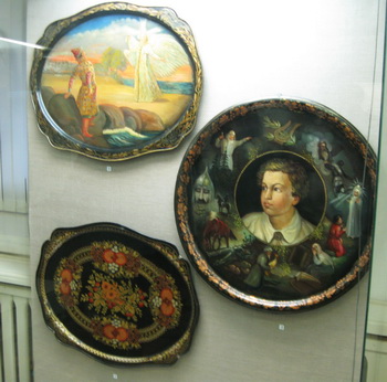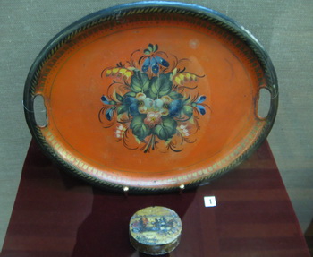 Одну часть экспозиции составляют классические образцы жостовской росписи. Она наносилась на подносы, изготовленные из тонкой кровельной стали. Подносы расписывались от руки. Как правило, на чёрном фоне изображали букеты цветов.
