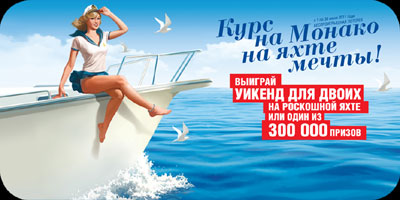 Всего будет разыграно три путёвки, в которые включена аренда яхты на двое суток и ужин. Абсолютно все участники лотереи станут обладателями одного из специальных призов: пляжного полотенца, модной пляжной сумки, солнцезащитных очков, элегантного браслета, летающей тарелки «фрисби» для подвижных игр, сверкающих наклеек-страз для тела. При использовании подарочных сертификатов РИВ ГОШ право на участие в акции предоставляется при обмене сертификата на товар.