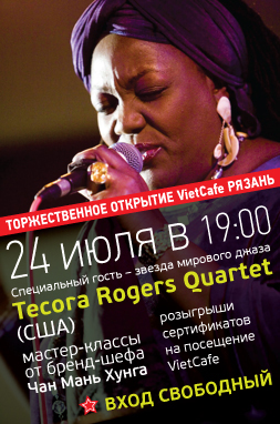 Кроме того, организаторы приготовили небольшой сюрприз: только 24 июля, только во «VietCafe Рязань» — специальный гость из Чикаго, звезда мирового джаза, обладательница множества музыкальных премий и наград, чей гастрольный график расписан на несколько лет вперёд, — великолепная певица Текора Роджерс.