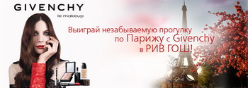 В незабываемую прогулку по Парижу предлагает отправиться магазин РИВ ГОШ, расположенный в галерее моды «Аркада». Акция проводится известной косметической маркой Givenchy с 1 по 31 августа. Лучших покупателей недели ждут приятные подарки — годовой запас косметики Givenchy, в который входят тональный крем, блеск для губ, тушь, набор теней. А покупатель месяца получит главный приз — week-end в Париже с личным экскурсоводом, посещение профессионального визажиста в одной из студий французской столицы, а также фотосессия в самых известных местах Парижа!